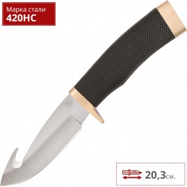 Нож отличный, качественный. Держит заточку. На охоте, буквально "на-колене" легко подправить "мусатиком". Я использую его для нарезки еды и закуски в поле/ на охоте.Кожаный чехол идет в комплекте.